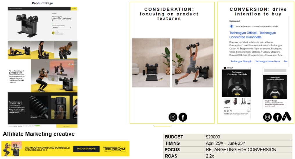 To drive top-of-funnel awareness, we leveraged affiliate marketing through premium publications and curated rewards programs aligned with our target audiences. While affiliate marketing is traditionally conversion-led, for a high-value product like Technogym it was repositioned as a cost-effective brand awareness and credibility channel.